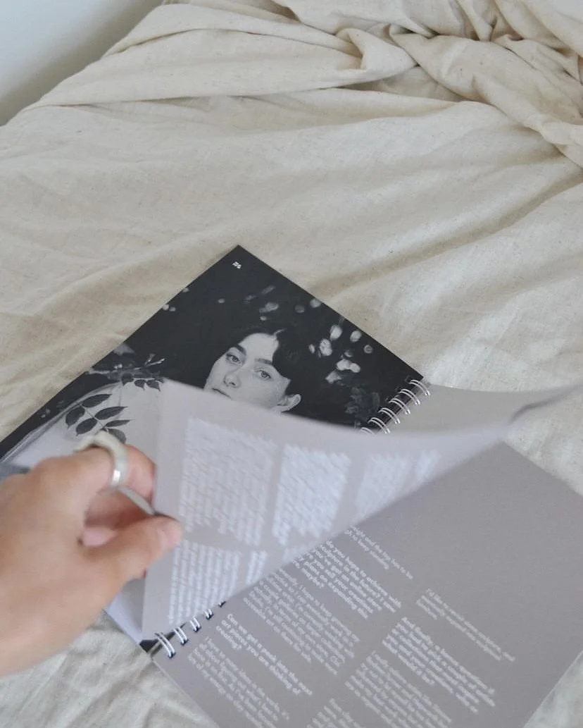 ‘She stands serenely in the middle of what seems to be a sunlight-dappled workshop, and in both hands, elegantly covered with silver and gold rings, she clutches a pale, speckled vase. The two handles which protrude out from either side of the vase make me think of a Roman amphora, reinterpreted and modernized.’